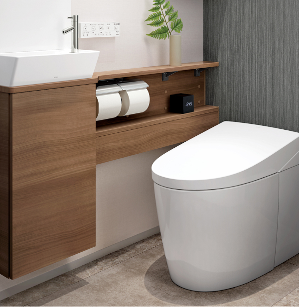 節水型の便器や汚れにくい素材、温水洗浄、脱臭、自動開閉などの便利な機能を備えたトイレで、掃除の手間が減りいつでも清潔で家族みんなが気持ちよく過ごせる心地よい毎日を支えます。
